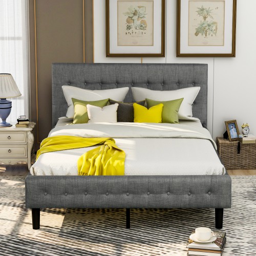 This queen size bed with storage drawers underneath feature linen upholstered tufted headboard with nail head trim and low profile oak wooden footboard with 2 drawers.